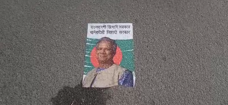 सिलीगुड़ी,24 दिसंबर(नि.सं.)। सिलीगुड़ी में एक बार फिर मोहम्मद यूनुस के खिलाफ पोस्टर लगाए गए है। यह पोस्टर एनजेपी थाना अंतर्गत इलाके में लगा देखा गया है। बांग्लादेश में भारतीय राष्ट्रीय ध्वज का अपमान, हिंदुओं पर अत्याचार बढ़ रहे हैं। इसके विरोध में कुछ दिन पहले सिलीगुड़ी में यूनुस के खिलाफ पोस्टर लगाए गए थे। इसके बाद आज फिर अंबिकानगर से लेकर एनजेपी के भालोबासा मोड़ तक सड़क के जगह-जगह यूनुस विरोधी पोस्टर लगाए गए हैं। जिसमें मोहम्मद यूनुस की तस्वीर है और लिखा है बांग्लादेशी जिहादी सरकार।