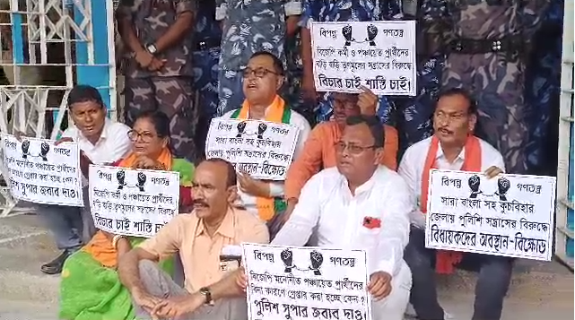 कूचबिहार,30 जून (नि.सं.)। जिले भर के भाजपा कार्यकर्ताओं पर संत्रास का आरोप लगाते हुए और भाजपा उम्मीदवार की अन्यायपूर्ण गिरफ्तारी का विरोध में भाजपा विधायकों और नेताओं ने कूचबिहार जिला पुलिस अधीक्षक के कार्यालय के सामने धरना प्रदर्शन किया है। बताया गया है कि आज सुबह भाजपा विधायकों और नेताओं ने जिला पुलिस अधीक्षक कार्यालय के सामने धरना प्रदर्शन किया।