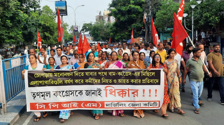 सिलीगुड़ी,15 जून (नि.सं.)। चोपड़ा में नामांकन पत्र जमा करने जा रहे वाम और कांग्रेस के रैली में फायरिंग में एक व्यक्ति की मौत हो गई, जबकि कई अन्य घायल हो गए है। इस घटना के विरोध में सिलीगुड़ी में दार्जिलिंग जिला सीपीएम आंदोलन में शामिल हुए है। सिलीगुड़ी के हिलकार्ट रोड स्थित सीपीएम के पार्टी कार्यालय से एक धिक्कार रैली निकाली गई।
