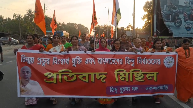 नक्सलबाड़ी,1 दिसंबर (नि.सं.)। बांग्लादेश के इस्कॉन लीडर चिन्मय कृष्ण दास की बिना शर्त रिहाई की मांग में नक्सलबाड़ी में एक प्रतिवाद रैली निकाली गई। आज नक्सलबाड़ी हिंदू सुरक्षा मंच के तत्वावधान में नक्सलबाड़ी रथखोला से इस्कॉन मंदिर तक उक्त प्रतिवादरैली निकाली गई।