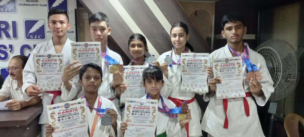सिलीगुड़ी, 5 अगस्त (नि.सं.)। सिलीगुड़ी के खिलाड़ियों ने स्वर्ण, रजत और कांस्य सहित कुल 10 पदक जीतकर दार्जिलिंग जिले और सिलीगुड़ी का नाम रोशन किया है। दरअसल, कोलकाता के नेताजी इंडोर स्टेडियम में 29 और 30 जुलाई को 7 वीं अंतर्राष्ट्रीय कराटे चैंपियनशिप आयोजित की गई थी। उक्त चैंपियनशिप में सिलीगुड़ी के कुल 11 खिलाड़ियों ने भाग लिया था। जिसमें सिलीगुड़ी के खिलाड़ियों ने 2 स्वर्ण, 2 रजत और 6 कांस्य पदक जीते है। जिसमें सोमनाथ कर ने रजत, मिग्मा शेरपा ने कांस्य, जेनेसिस राय ने रजत, रूही यादव ने स्वर्ण, नितिन यादव ने कांस्य, अंकति सानुयसी ने कांस्य, सुभांजलि बागदास ने रजत, सुजल विश्वकर्मा ने स्वर्ण, धीरज थामी ने कांस्य और आकांशा सेन ने कांस्य पदक जीती है। इचिबान स्पोर्ट्स अकादमी के सदस्यों ने शनिवार को सिलीगुड़ी जर्नलिस्ट्स क्लब में संवाददाता सम्मेलन कर यह जानकारी दी है।