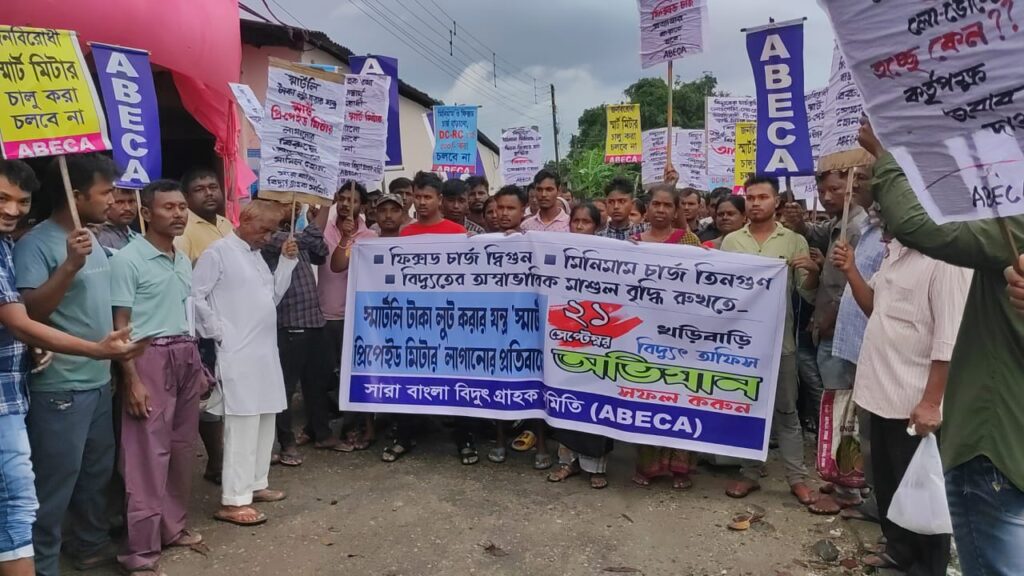 खोरीबाड़ी,21 सितंबर (नि.सं.)। बिजली के फिक्स चार्ज को दोगुना करने, न्यूनतम चार्ज को तीन गुना करने, जनविरोधी स्मार्ट मीटर,लगातार लोड शेडिंग और अत्यधिक बिल के खिलाफ सारा बांग्ला विद्युत ग्राहक समिति ने एक विरोध रैली निकाली है।