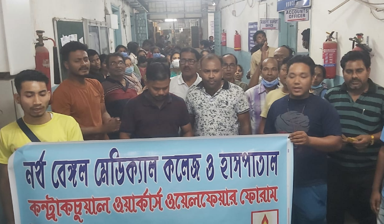 सिलीगुड़ी,10 अप्रैल(नि.सं.)। स्व-वेतन अवकाश, स्थायीकरण सहित कई मांगों के समर्थन में नॉर्थ बंगाल मेडिकल कॉलेज एवं अस्पताल कंट्रक्चुअल वर्कर्स वेलफेयर फोरम आंदोलन में शामिल हो गया है। बताया गया है कि आज संगठन के सदस्यों ने अधीक्षक के आवास के सामने काफी देर तक प्रदर्शन किया।