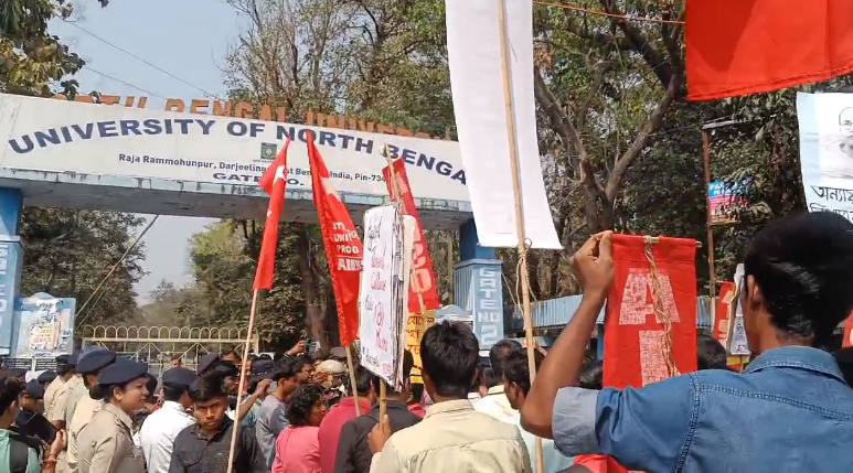 एआईडीएसओ नेता और कार्यकर्ता एक रैली के माध्यम से उत्तरबंग विश्वविद्यालय पहुंचे, लेकिन पुलिस ने रैली को गेट के सामने ही रोक दिया। पुलिस के बाधाओं के कारण एआईडीएसओ नेताओं और कार्यकर्ताओं ने सड़क पर ही विश्वविद्यालय अधिकारी को एक ज्ञापन सौंपा। संगठन के राज्य सचिव विश्वजीत राय ने कहा कि हमें रोका गया लेकिन विश्वविद्यालय के अधिकारी सड़क पर आकर ज्ञापन लिया है। यह एक नैतिक जीत है। वहीं, कार्यवाहक रजिस्ट्रार डॉ. नूपुर दास का मानना है कि विश्वविद्यालय में राजनीति प्रवेश नहीं करेगी।