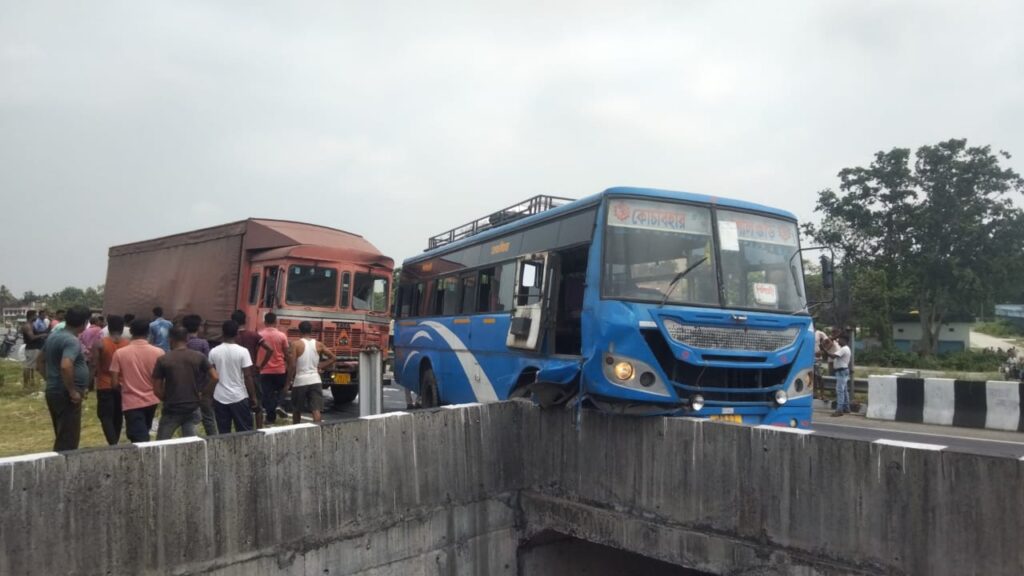 स्थानीय सूत्रों के अनुसार एक यात्री बस जलपाईगुड़ी से सिलीगुड़ी की ओर आ रही थी। तभी तालमा संलग्न इलाके में बस की एक मालवाहक कंटेनर से टक्कर हो गयी। जिसके चलते यात्री बस अनियंत्रित होकर सड़क के किनारे कलवर्ट की रेलिंग पर चढ़ गई।