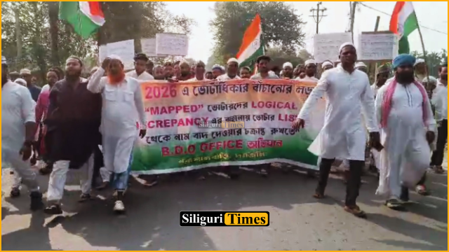 प्रदर्शनकारियों ने राष्ट्रीय ध्वज लेकर नक्सलबाड़ी बीडीओ कार्यालय के सामने विरोध जताया। उनका आरोप है कि कई अल्पसंख्यक मतदाताओं के नाम मतदाता सूची से चुन-चुनकर हटा दिए गए है।जानकारी के अनुसार, कई लोगों का कहना है कि वर्ष 2002 से उनका नाम मतदाता सूची में था, लेकिन अब अचानक उन्हें “विचाराधीन” सूची में डाल दिया गया है और कई नाम हटा दिए गए है। आरोप है कि यह इलेक्शन कमीशन की मिलीभगत से किया गया।