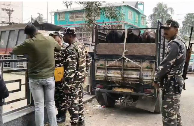 नक्सलबाड़ी, 23 दिसंबर(नि.सं)। सर्दियों के मौसम में कोहरे की आड़ में इंडो-नेपाल बॉर्डर से गाय तस्करी की योजना को नाकाम कर दिया गया है। 3 गाय और 2 बछड़े बरामद किए गए है। बताया जा रहा है कि मंगलवार सुबह, SSB ने नक्सलबाड़ी में इंडो-नेपाल बॉर्डर पर बड़ा मनीराम जोत में मेची नदी के पास गाय तस्करी की योजना को नाकाम कर दिया और 5 गायों को बरामद किया।SSB जवानों को देखकर आरोपी गायों को छोड़कर नेपाल की ओर भाग गए। बाद में बचाई गई गायों को नक्सलबाड़ी थाने की पुलिस को सौंप दिया गया। आरोपियों की तलाश शुरू कर दी गई है।