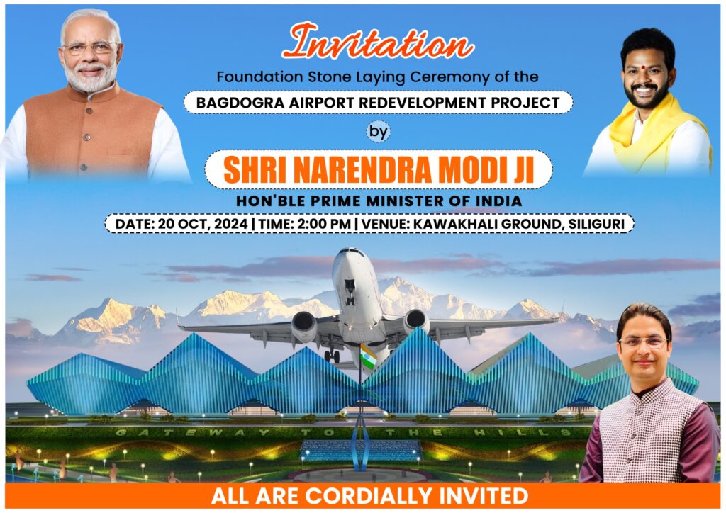 सिलीगुड़ी,18 अक्टूबर (नि.सं.)। प्रधानमंत्री नरेंद्र मोदी 20 अक्टूबर को बागडोगरा हवाई अड्डे के नए टर्मिनल प्रोजेक्ट की शिलान्यास करेंगे। दार्जिलिंग के सांसद राजू बिष्ट ने एक प्रेस विज्ञप्ति जारी कर यह जानकारी दी है। बागडोगरा हवाई अड्डे से हर दिन कई लोग यात्रा करते है।