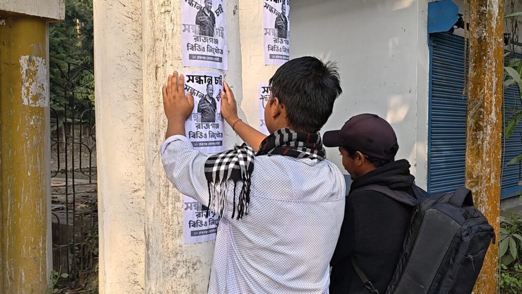 राजगंज, 27 दिसंबर(नि.सं.)। राजगंज के बीडीओ प्रशांत बर्मन की तलाश को लेकर शनिवार को पूरे राजगंज में लापता लिखे पोस्टर चिपकाए गए है। पोस्टर में “संधान चाहिए, संधान चाहिए राजगंज के बीडीओ लापता” लिखे पोस्टर बीडीओ कार्यालय के सामने लगाए गए। यह पोस्टर एसएफआई की राजगंज लोकल कमेटी की ओर से लगाए गए। उल्लेखनीय है कि कलकत्ता हाईकोर्ट ने बीडीओ प्रशांत बर्मन को आत्मसमर्पण करने का निर्देश दिया था, लेकिन इसके बाद से वह कार्यालय नहीं आ रहे हैं। शुक्रवार को विधाननगर पुलिस कमिश्नरेट की अर्जी पर विधाननगर महकमा अदालत ने उनके खिलाफ गिरफ्तारी वारंट जारी किया।