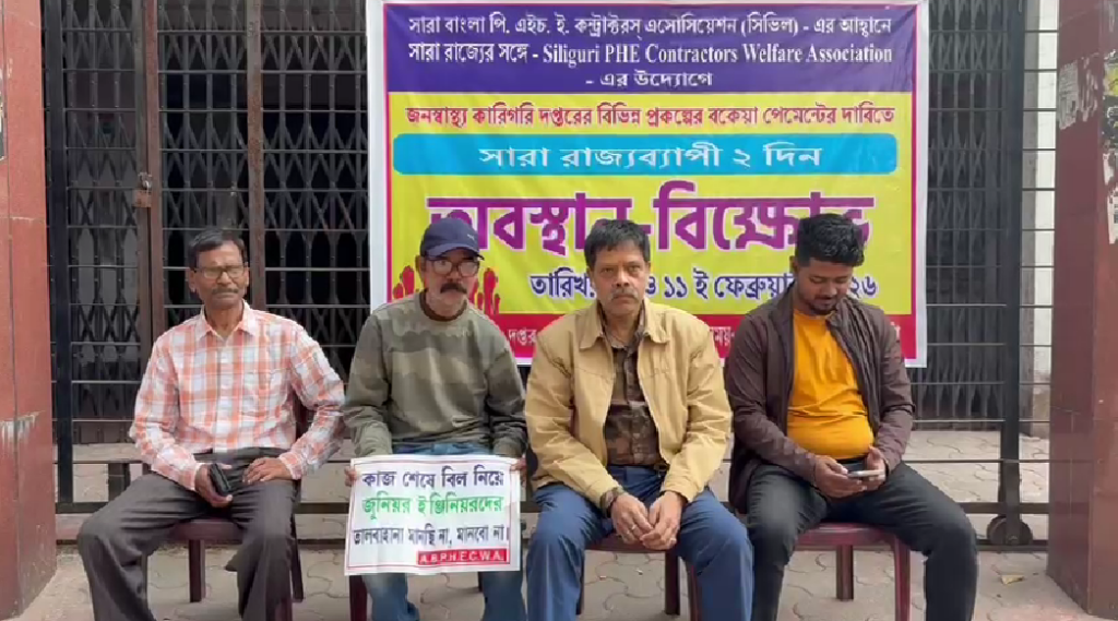 सिलीगुड़ी, 11 फरवरी(नि.सं.)। जनस्वास्थ्य अभियंत्रण (पीएचई) विभाग की विभिन्न परियोजनाओं के बकाया भुगतान की मांग को लेकर सिलीगुड़ी में दो दिवसीय धरना-प्रदर्शन कार्यक्रम शुरू किया गया। यह आंदोलन ‘सारा बंगाल पीएचई कॉन्ट्रैक्टर्स एसोसिएशन (सिविल)’ के आह्वान पर तथा ‘सिलीगुड़ी पीएचई कॉन्ट्रैक्टर्स वेलफेयर एसोसिएशन’ के नेतृत्व में आयोजित किया गया है।