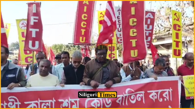 सिलीगुड़ी, 17 दिसंबर (नि.सं)। केंद्रीय ट्रेड यूनियन फेडरेशनों और संयुक्त किसान मोर्चा की ओर से विभिन्न मांगों को लेकर सिलीगुड़ी में विरोध प्रदर्शन और रैली निकाला गया। इस दौरान प्रदर्शनकारियों ने पीएफ कार्यालय का घेराव कर जोरदार विरोध जताया। इस विरोध कार्यक्रम में विभिन्न श्रमिक संगठनों और किसान संगठनों के सदस्य शामिल हुए। श्रमिकों के हितों की रक्षा, पीएफ से संबंधित लंबित मांगों को पूरा करने तथा किसानों के न्यायसंगत अधिकार सुनिश्चित करने की मांग को लेकर यह आंदोलन किया गया।
