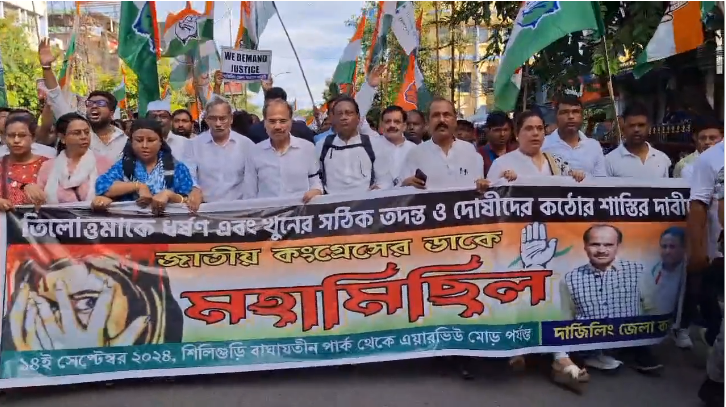 सिलीगुड़ी,14 सितंबर (नि.सं.)।आरजी कर मामले में दोषियों को कड़ी सजा देने की मांग में दार्जिलिंग जिला कांग्रेस ने आज सिलीगुड़ी में एक महा रैली निकाली गई। इस महा रैली में प्रदेश कांग्रेस अध्यक्ष अधीर रंजन चौधरी शामिल हुए। यह रैली सिलीगुड़ी के बाघाजतिन पार्क से शुरू हुई जो शहर के विभिन्न इलाकों की परिक्रमा करते हुए एयरव्यू मोड़ पर जाकर संपन्न हुई।