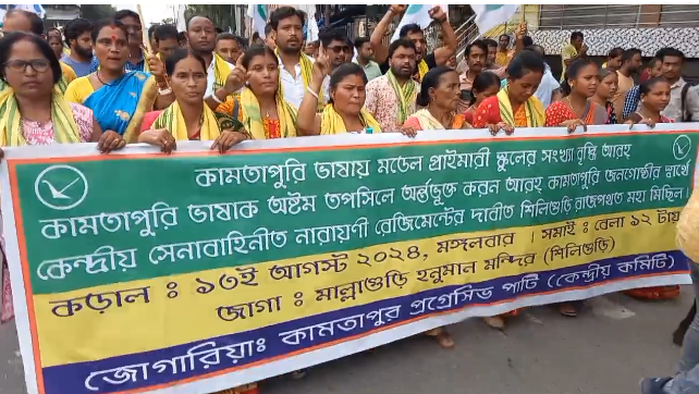 सिलीगुड़ी,13 अगस्त(नि.सं.)। कामतापुर प्रोग्रेसिव पार्टी ने कई मांगों को लेकर सिलीगुड़ी में एक रैली निकाली। मंगलवार को यह रैली मल्लागुड़ी से शुरू हुई, जो विभिन्न मार्गों की परिक्रमा करते हुए कोर्ट मोड़ पर पहुंचकर समाप्त हुआ।