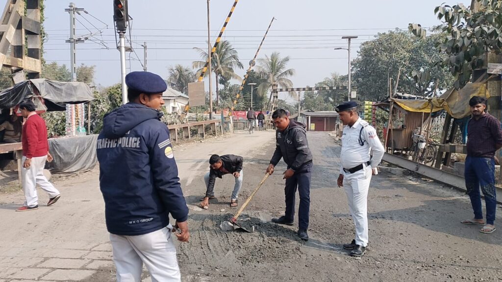 राजगंज,3 जनवरी (नि.सं.)। ट्रैफिक पुलिस के कर्मियों ने सड़क के बीच बने गड्ढों को दुरुस्त करने का बीड़ा उठाया है। आज आमबाड़ी रेलगेट के सामने ऐसे ही तस्वीर देखने को मिली है।बताया गया है कि सिलीगुड़ी से गाजलडोबा जाने वाली एकमात्र सड़क लंबे समय से जर्जर है।